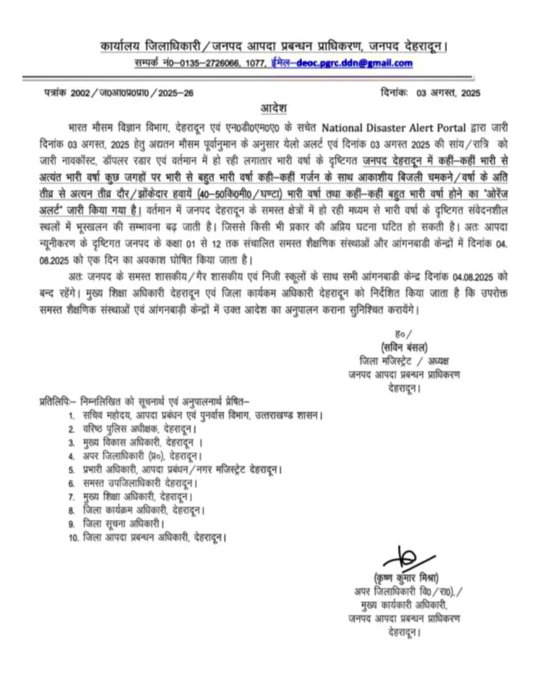 देहरादून: राजधानी देहरादून समेत राज्य के कई जिलों में भारी बारिश की संभावना को देखते हुए ऑरेंज अलर्ट जारी किया...