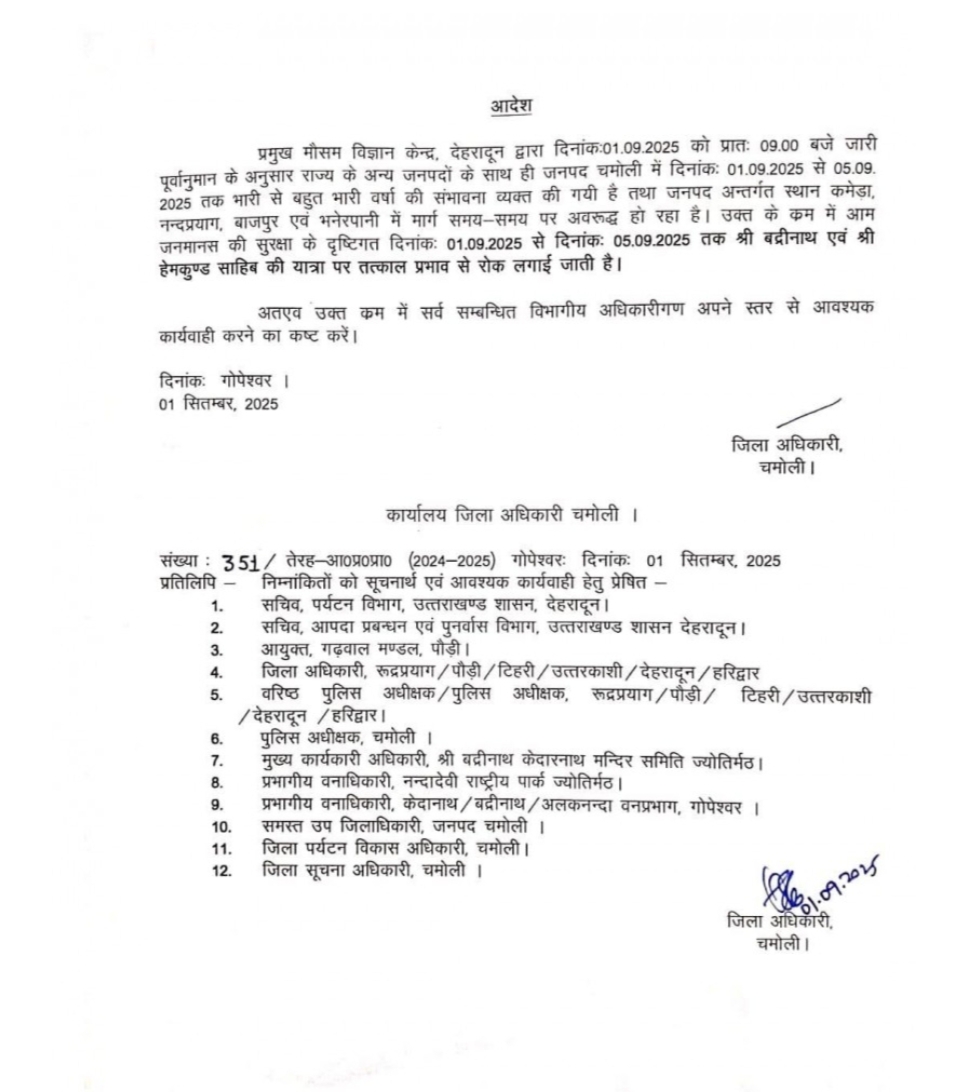 चारधाम व हेमकुण्ड साहिब यात्रा 5 सितम्बर तक स्थगित..