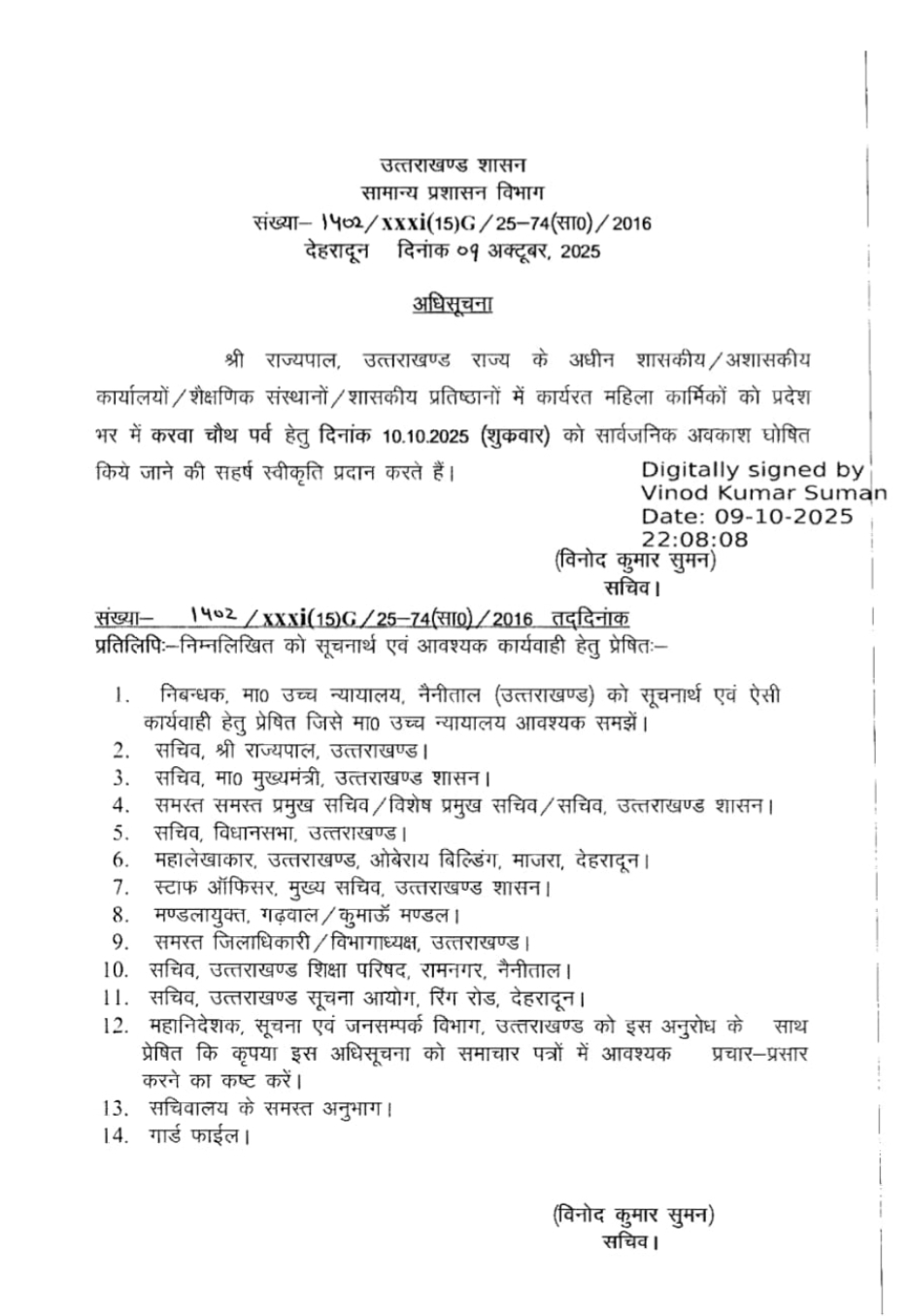 देहरादून: उत्तराखंड सरकार ने करवा चौथ के अवसर पर महिलाओं के लिए अवकाश की घोषणा कर दी है। शुक्रवार, 10 अक्टूबर को करवा चौथ का व्रत रखा जाएगा, जिसे लेकर महिलाएं पूरे दिन अवकाश की उम्मीद लगाए बैठी थीं। देर रात शासन से आदेश जारी होने के बाद महिलाओं में खुशी की लहर दौड़ गई..
